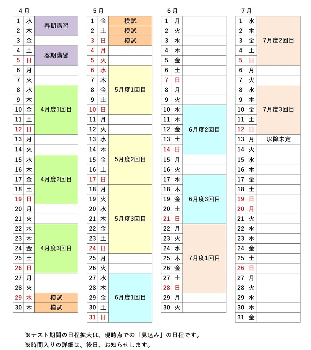 ■ 日程 開校しているのは月に3回(3週)です。※高校生は模試はありません。