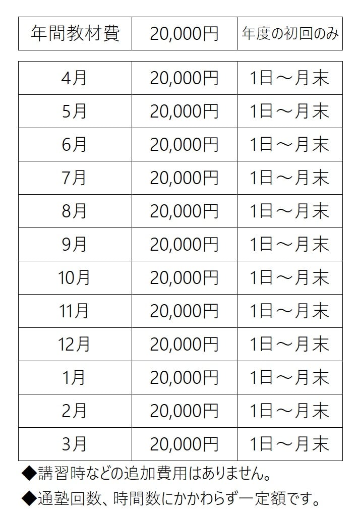 通塾回数、時間数に関係なく同額です。