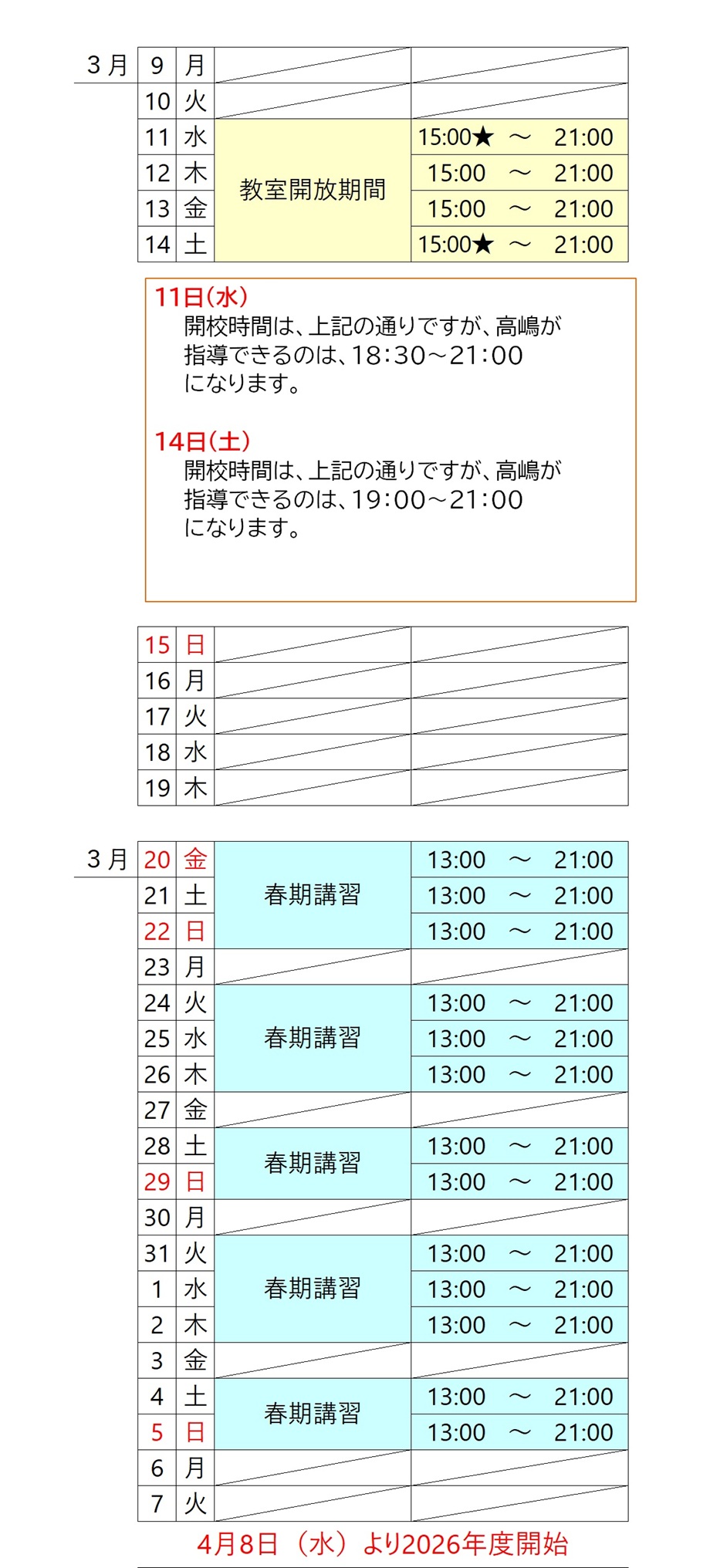 ■ 曜日時間 開校時間